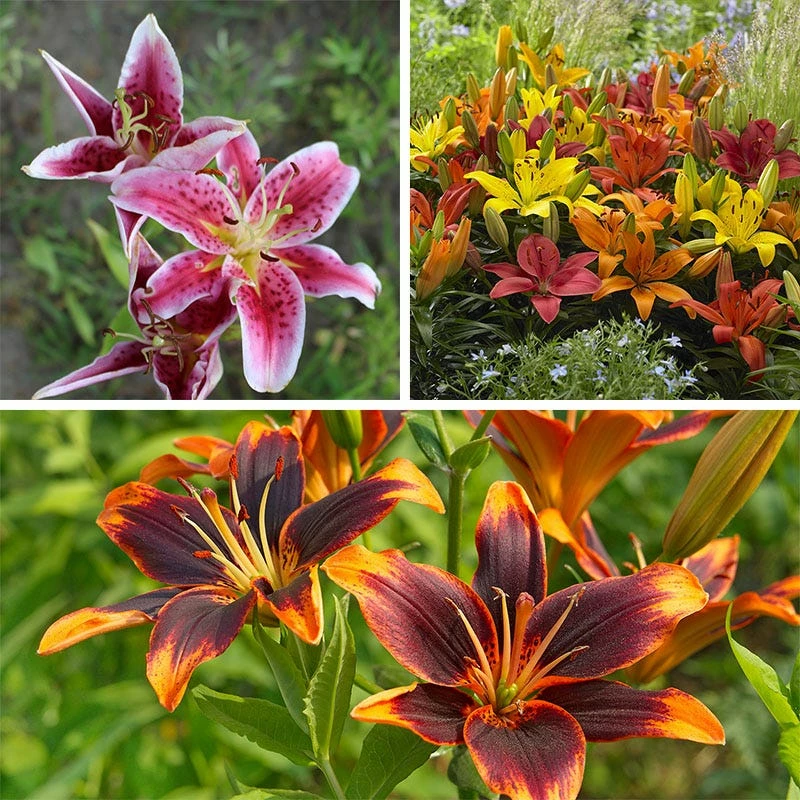Our Evening Sunset Lily Collection pairs Asiatic and Oriental lilies for dazzling bloom power over a long season. This collection adds color and height to even the smallest of spaces. The colorful yellows, oranges, and reds of the ‘Sunset Asiatic Lily Mix’ contrast nicely with the blooms of ‘Forever Susan’ which pairs dark plum with vibrant orange for a striking color combination. Intersperse the planting with ‘Stargazer’ Oriental Lily which reaches 28-36″ tall and keeps the collection blooming through summer’s end. Asiatic and Oriental Lilies can be planted among perennials to bridge the gap between spring blooming bulbs and perennial blooms. With their upward-facing blooms, these lilies are ideal for making bouquets. In the garden, provide full to partial sun and a rich, well-drained soil.
