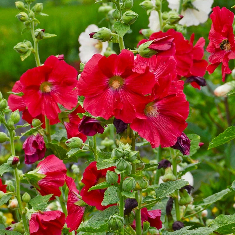 (60-72″ tall x 18-24″ wide) ‘Mars Magic’ Single Hollyhock (Alcea rosea) is a pollinator favorite, classic perennial that lights up the garden with single scarlet blossoms 4 inches across. Its red saucer-like flowers open from the bottom of the stalk upwards. Exceptionally bright, the flowers are plentiful, and each plant grows several stalks 5-6 feet tall. They don’t need staking, and look beautiful at the back of a bed or along a wall or fence where they can add a romantic backdrop to other flowers. Plant ‘Mars Magic’ in average to compost-enriched soil with good drainage in a sunny location. Provide average watering, they are drought tolerant once established. Deer and rabbit resistant, they are a perfect choice for care-free high color. Cut them back when flowering has finished or leave the seed pods for winter interest and the birds. Hardy in zones 3-9, they won’t tolerate wet feet in winter.