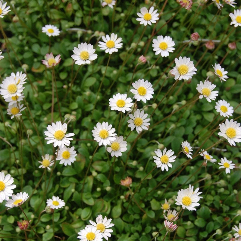 Bellium is a vigorous grower, covering itself with a multitude of 1/2″ white daisies from late spring through the summer.