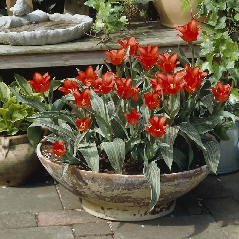 Tulipa greigii ‘Red Riding Hood’ harmonizes a spring garden with its big, bright scarlet-red flowers with black hearts and deftly shaded deep red petals. The striped leaves are almost as spectacular as the flowers, giving this perennial tulip long lasting garden appeal. Standing on sturdy 10-12″ stems, the large, open flowers often span 4-5″ wide! Sometimes known as Rock Garden Tulips, they will naturalize easily when happy. For best results plant in groupings of 10-15 bulbs. Planted in full sun for best color, to part-shade for longer bloom times, these hardy, easy-to-grow bulbs will light up a mid-spring garden. ‘Red Riding Hood’ won the prestigious Award of Garden Merit of the Royal Horticulture Society and is one of the world’s most popular Greigii tulips.