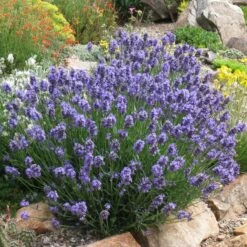 What an incredible Dwarf English Lavender! ‘Thumbelina Leigh’ is very showy with its deep purple-blue calyxes and dark lavender flowers held on sturdy, well-branched stems. Nice blue-green foliage. A heavy bloomer with plump yet tight flower heads, its compact size makes it useful as an edging plant along paths, in rock gardens or mixed with other taller Lavender cultivars. (cutting propagated)