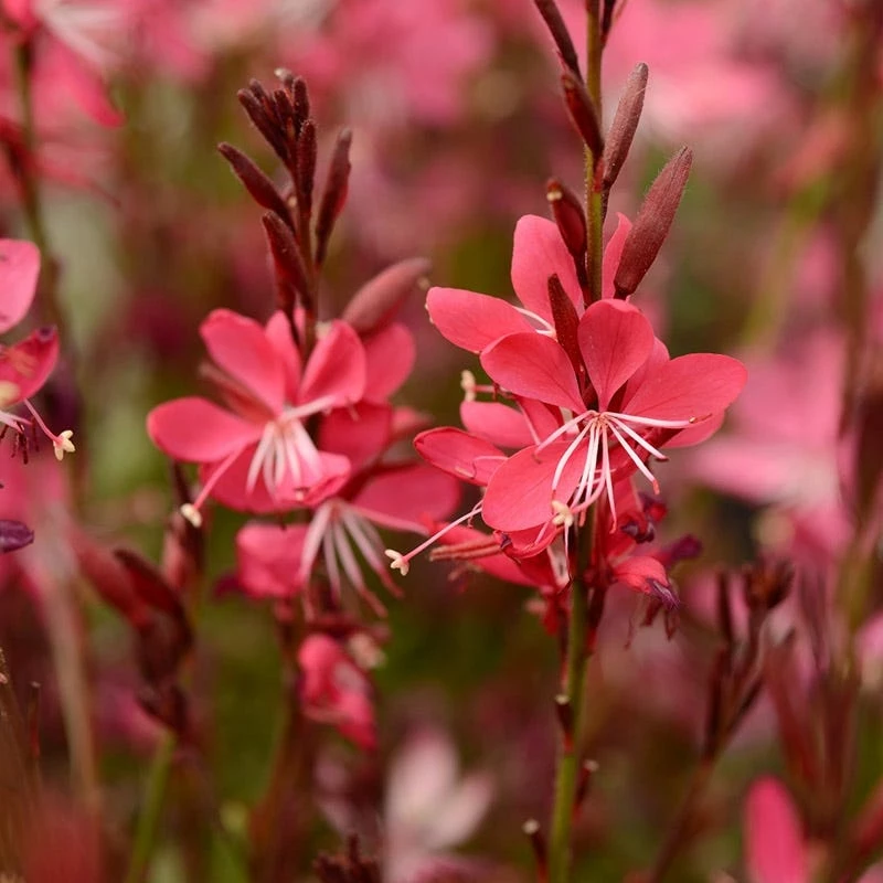 Whiskers Deep Rose Appleblossom Grass (Gaura lindheimeri Whiskers Deep Rose PP26,399) is a compact variety selected for its deep pink flowers and attractive burgundy foliage. Long blooming, it colors the garden or container all summer. Gaura is also commonly known as Wand Flower and Beeblossom.